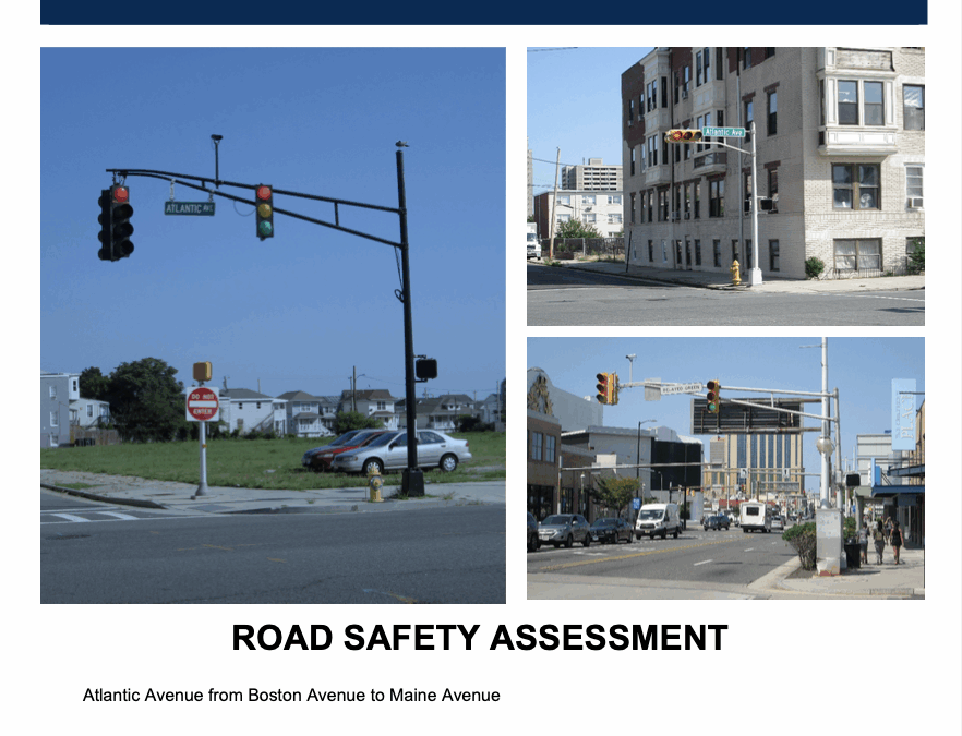 PDF cover, reading January 2020, Road Safety Assessment, Atlantic Avenue, Atlantic City, Atlantic County, NJ, then there are three images of the route, rather car-oriented in design, followed by text: Road Safety Assessment, Atlantic Avenue from Boston Avenue to Maine Avenue
