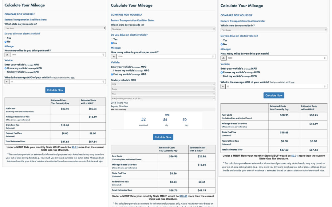 From Left to Right: Milage calculator tool for MBUF for average vehicle with 23 Miles per gallon, they would pay about one cent more in fees to drive 1000 miles. Second: Hybrid mileage calculation for 1000 miles with 2018 toyota prius, they would pay $10.43 more under MBUF than the $38.76 they currently pay, and third and finally: Mileage calculation for EV driving 1000 miles, they would have to pay an extra $18.69, and are paying $0 now using traditional gas tax.