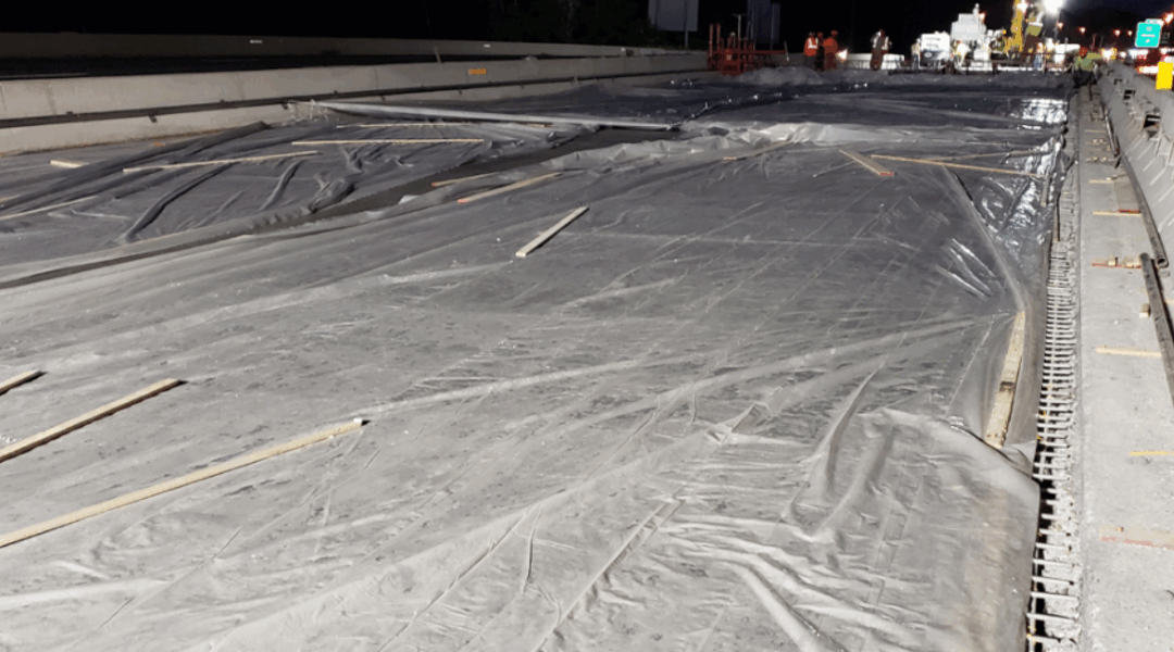 A bridge with a plastic cover at night, waiting for the UHPC to cure