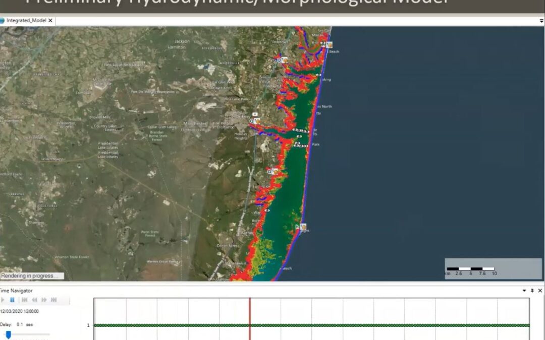 Dr. Barone shared several visualizations and explained how the hydrodynamic /morphological model can be used to optimize locations, configurations, and timing of dredge materials placement