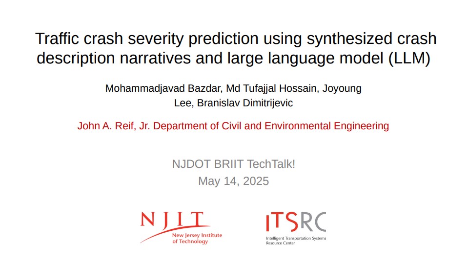 Presentation #2 – Traffic Crash Severity Prediction Using Synthesized Crash Description Narratives and Large Language Models (LLM) by Mohammadjavad Bazdar, New Jersey Institute of Technology