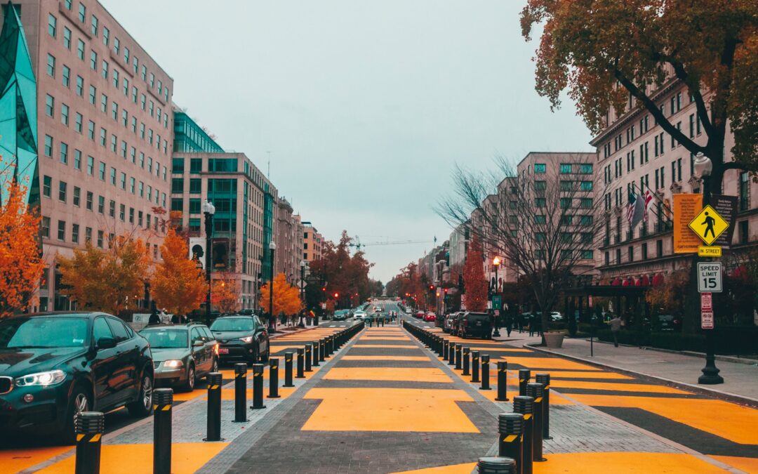 A “complete street” in Washington, D.C. with several community livability features for an urban setting such as wide sidewalks with tree coverage, traffic calming design, and a physically protected middle bike lane.  Photo by Maria Oswalt on Unsplash.