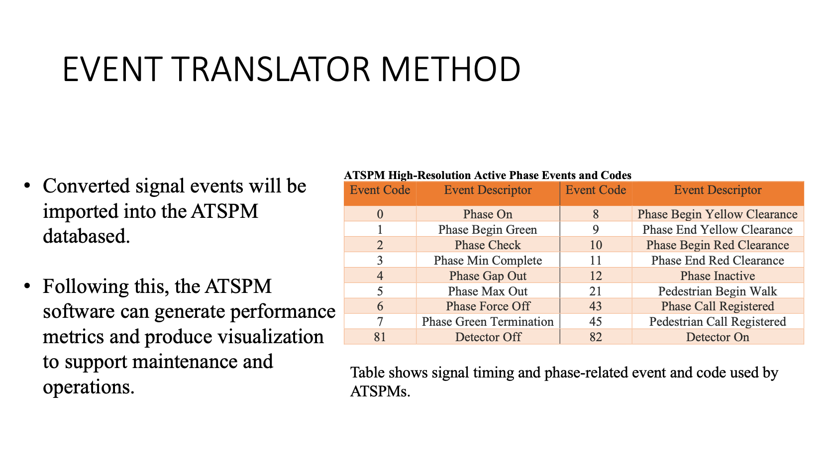 A team of students from Rutgers, The College of New Jersey, and Rowan University worked with Dr. Jin to bridge data from ATSC to ASTPM. The proposed solution is a program that automatically retrieves traffic controller event logs and then translates them into ASTPM event code, a method that is agnostic to controller type. This allows for a wide variety of data to be collected, and then viewed and optimized using standard ASTPM methods.
