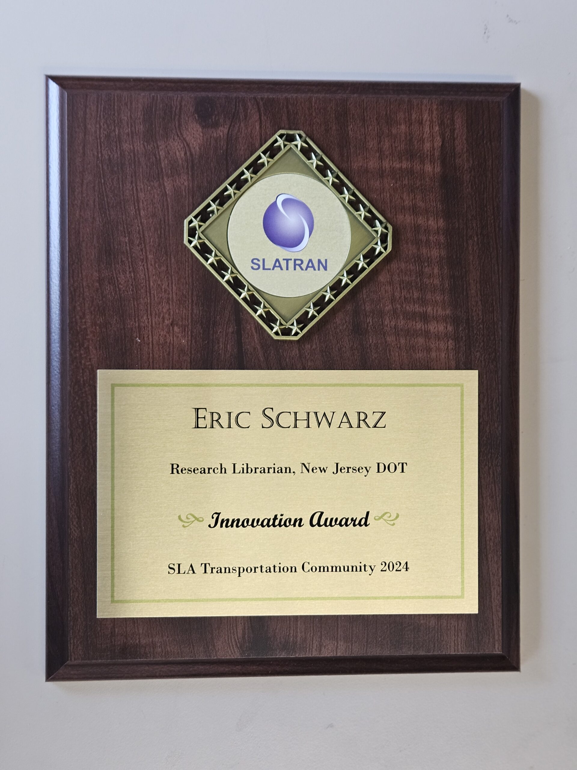 Eric Schwarz, NJDOT’s Research Librarian, received a plaque as honoree of the SLA Transportation Community’s 2024 Innovation Award.